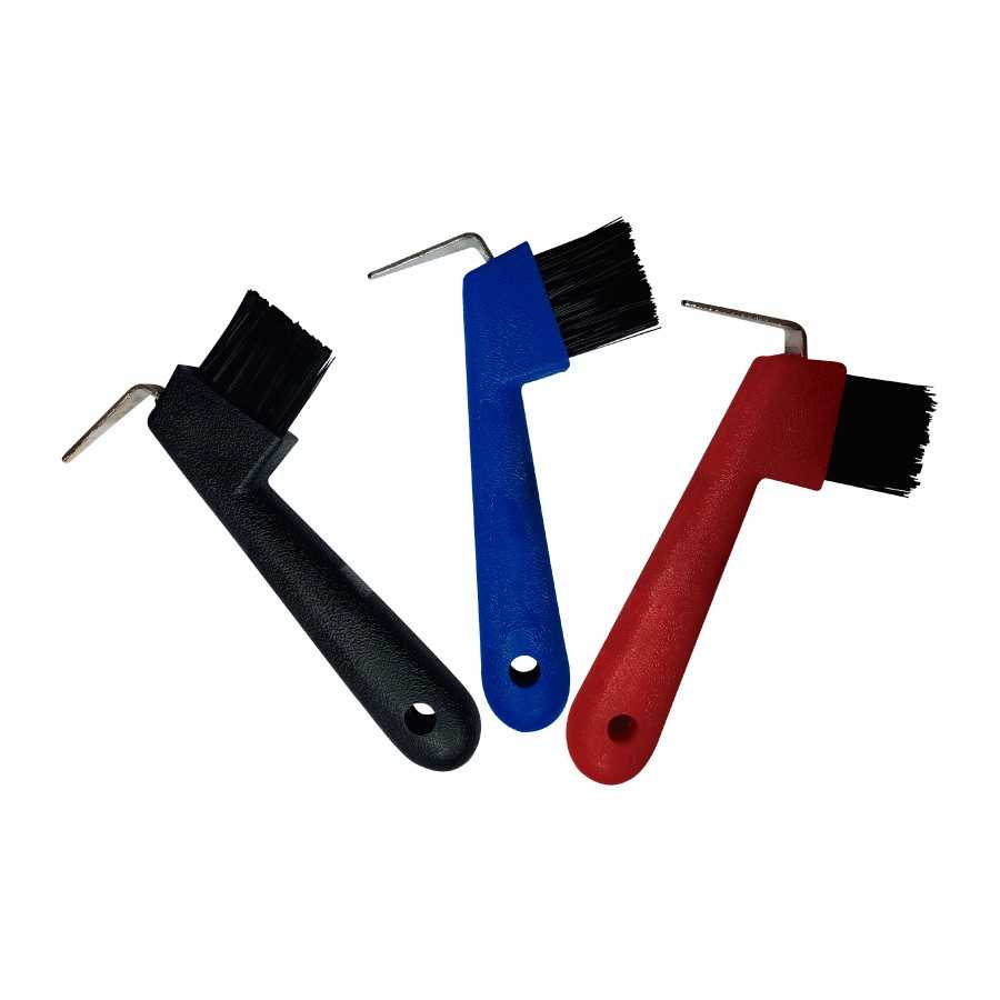 Cepillo y gancho limpiacascos con mango anatómico de plástico con cabeza de caballo. Longitud: 20 cm