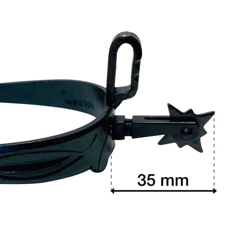 Espuela de primera calidad utilizada en la monta tradicional vaquera española, con acabado pavonado y ruleta vaquera con estrella de 8 puntas.