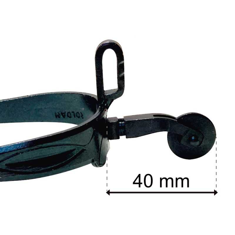 Espuela de primera calidad utilizada en la monta tradicional vaquera española, con acabado pavonado y ruleta moneda.