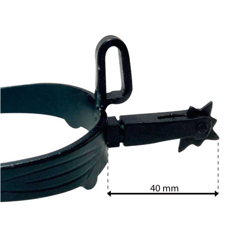Espuela económica utilizada en la monta tradicional vaquera española, con acabado pavonado y ruleta vaquera con estrella de 8 puntas.