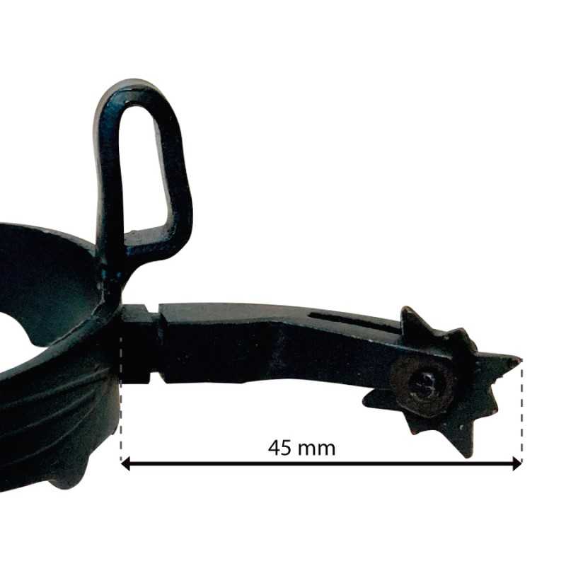 Espuela económica utilizada en la monta tradicional vaquera española, con acabado pavonado y ruleta vaquera con estrella de 8 puntas.
