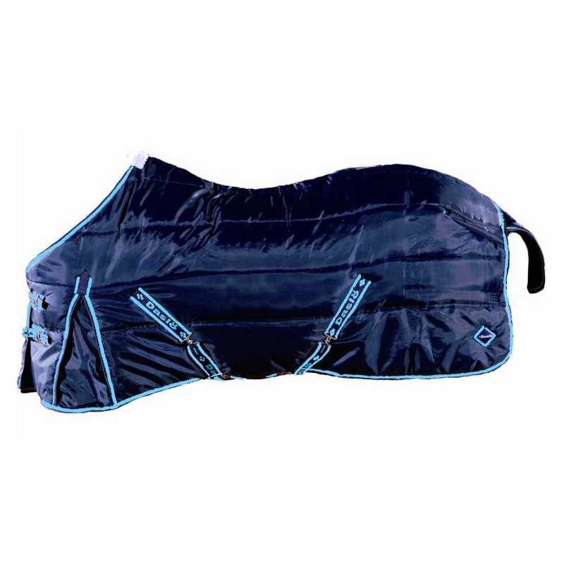 Pespunte horizontal – tejido exterior poliéster 420D – relleno polyfill 250 gr- forro en nylon – con cubrecola, pliegues delanteros, dos correas de cierre delantero con hebillas – correas para los miembros de atrás – protección en la cruz en borreguillo sintético – correas cruzadas.