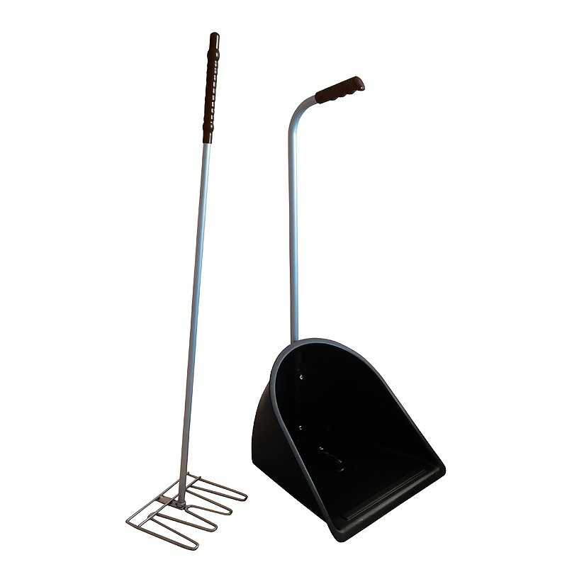 Recogedor y rastrillo metálico para limpiar el establo. Mangos en material adherente para un mejor agarre. Medida del recogedor: 36 x 76 cm Los mangos del recogedor y del rastrillo están incluídos.